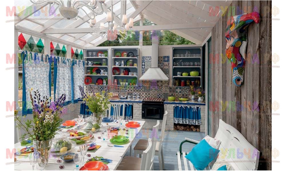 Мы построили классическую беседку в духе стародачных поселков, но с современными акцентами. Ведь хозяева – очень молодая семья! Беседку отличают расписные стеклянные витражи, амбарная доска, прозрачная крыша, кухонный ряд, отделанный метлахской плиткой, и классический белый цвет. А поскольку хозяева рыболовы и охотники, то над большим столом мы повесили «чучело» коровы из папье-маше. Влад Пискунов угостит всех своим неожиданным блюдом, а Ольга Платонова расскажет, как приготовить кофе из лопуха!