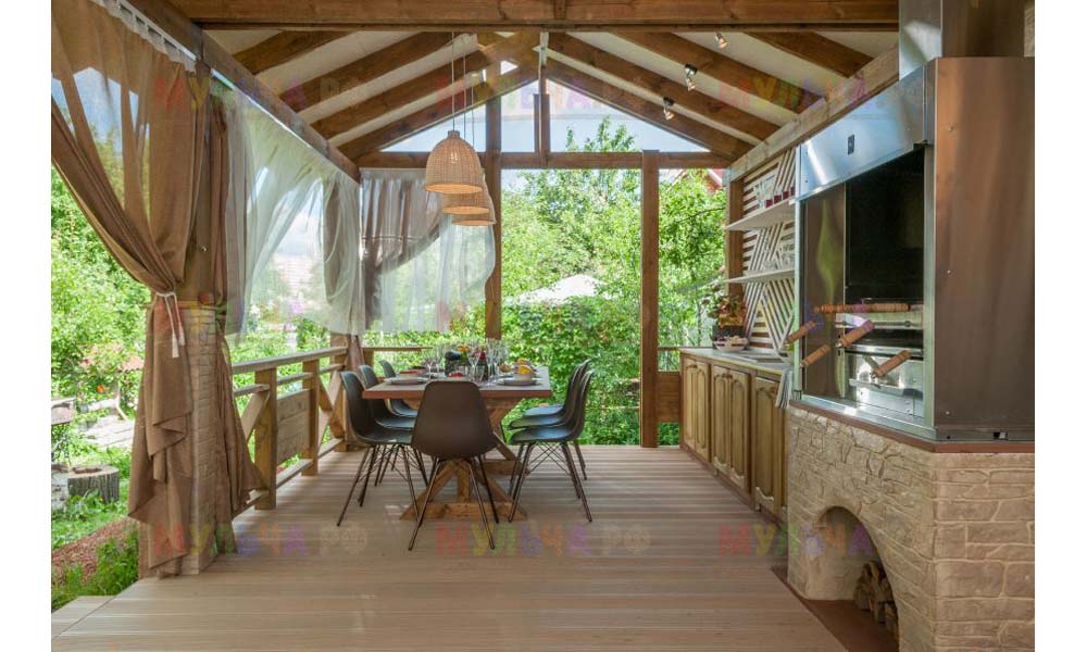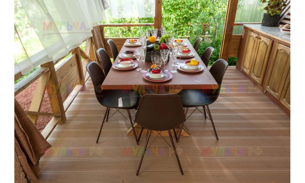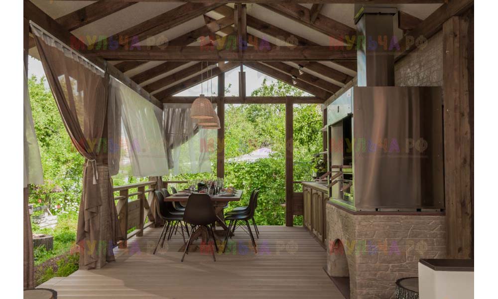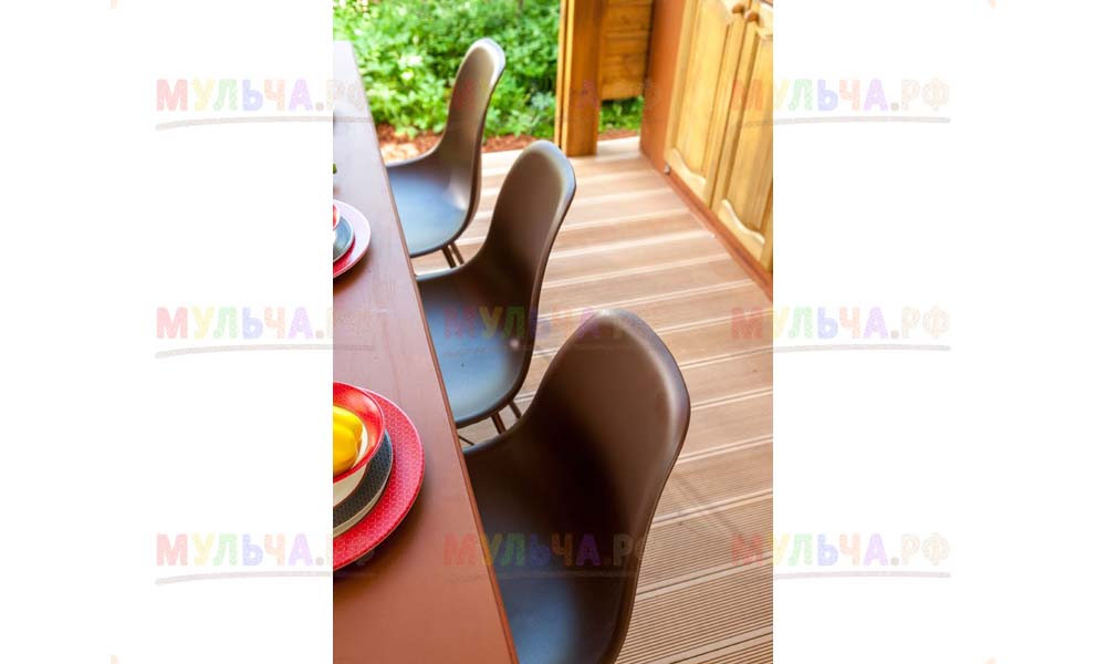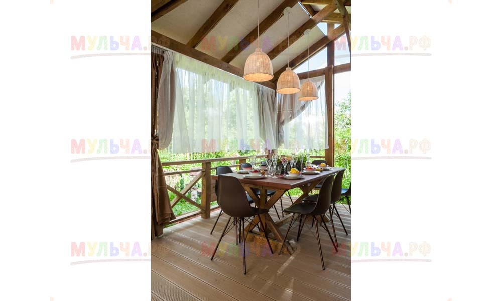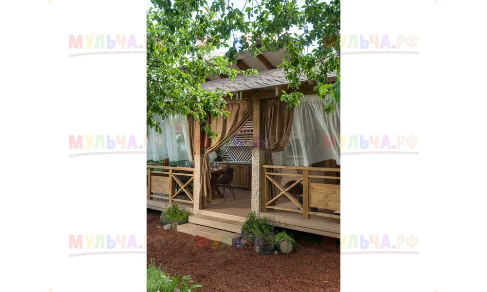 Интересно, что сейчас очень многие дизайнеры выбирают именно такой способ оформления почвы вокруг беседок, веранд и террас. Впрочем, это легко объяснимо. Кора лиственницы проста и удобна в использовании, она устойчива к различным негативным факторам окружающей среды и, следовательно, долговечна.
