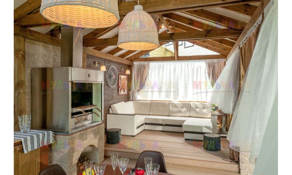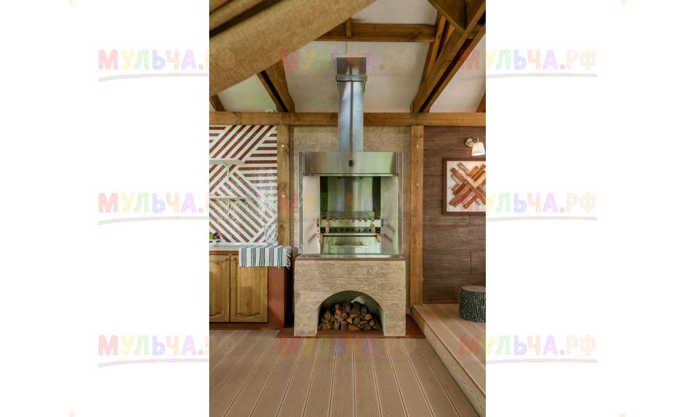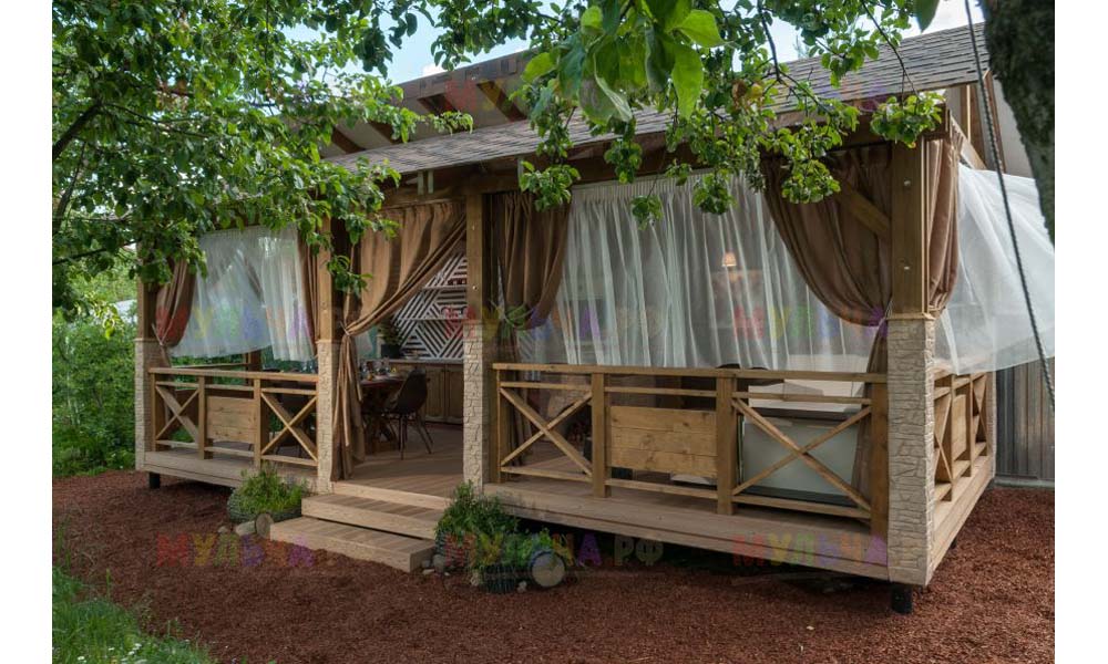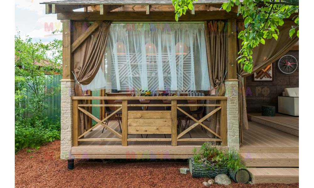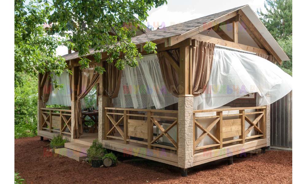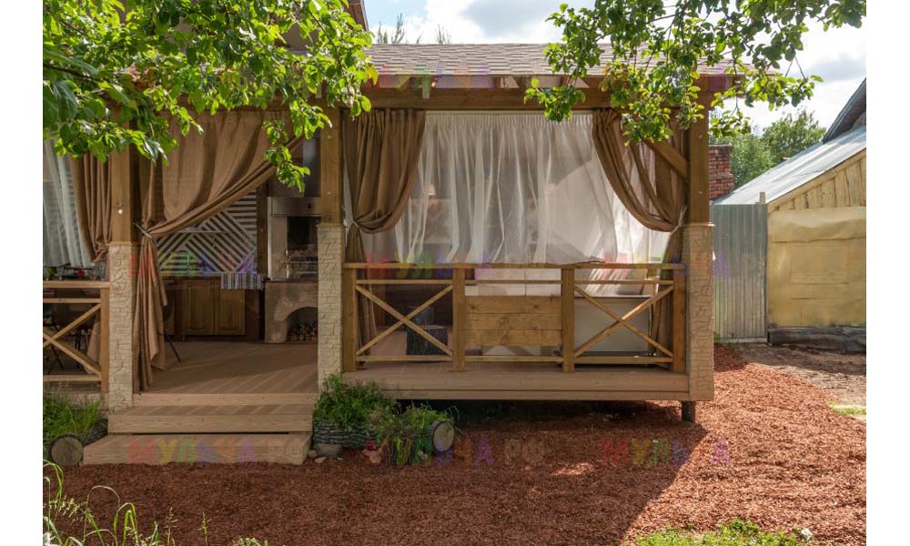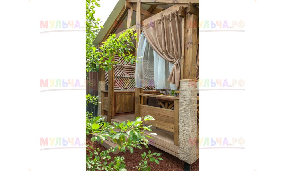 Наша компания поставляла для этого проекта кору лиственницы фракции 1-3 сантиметра. Кора использовалась для декоративной отсыпки вокруг беседки.