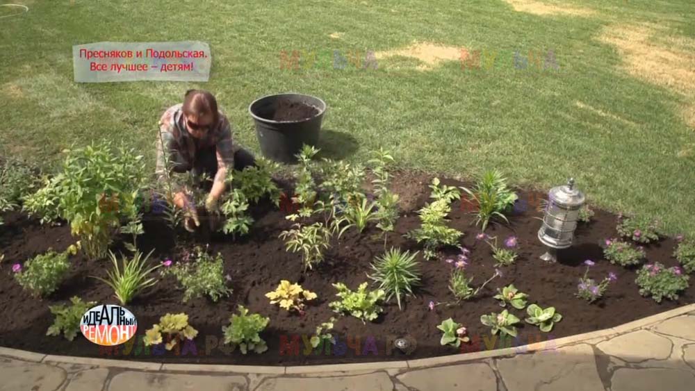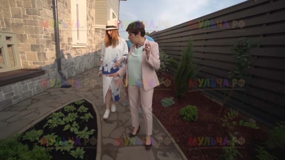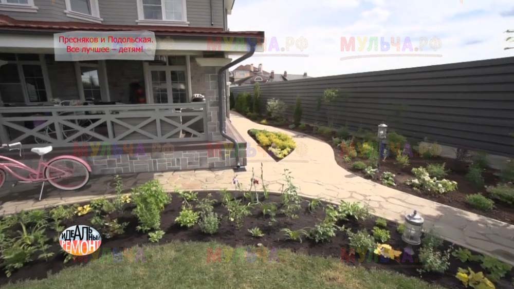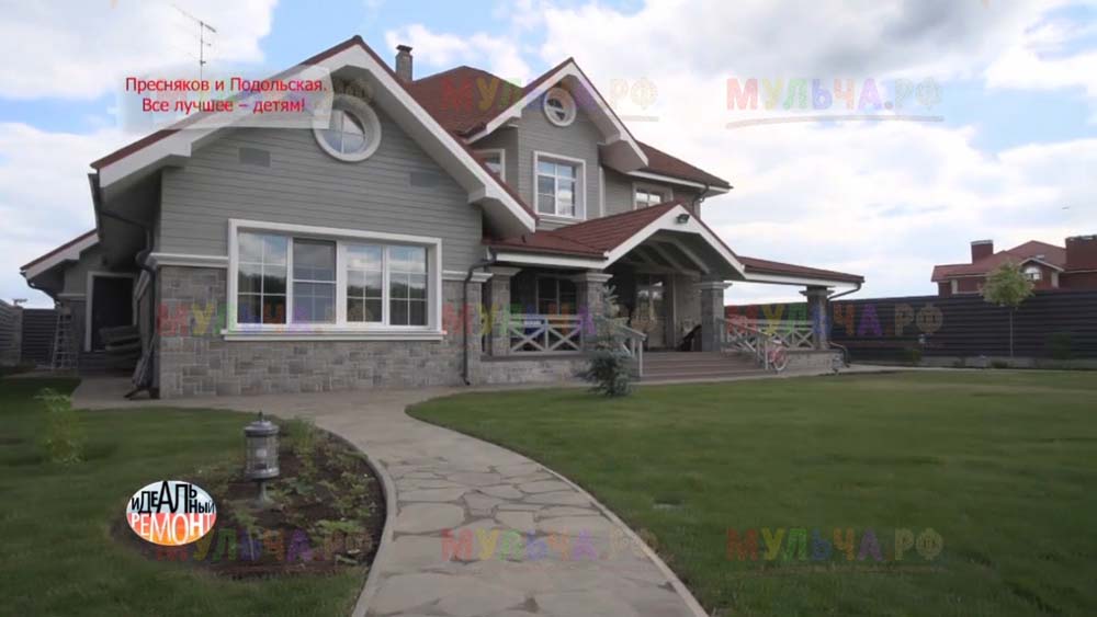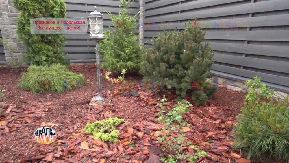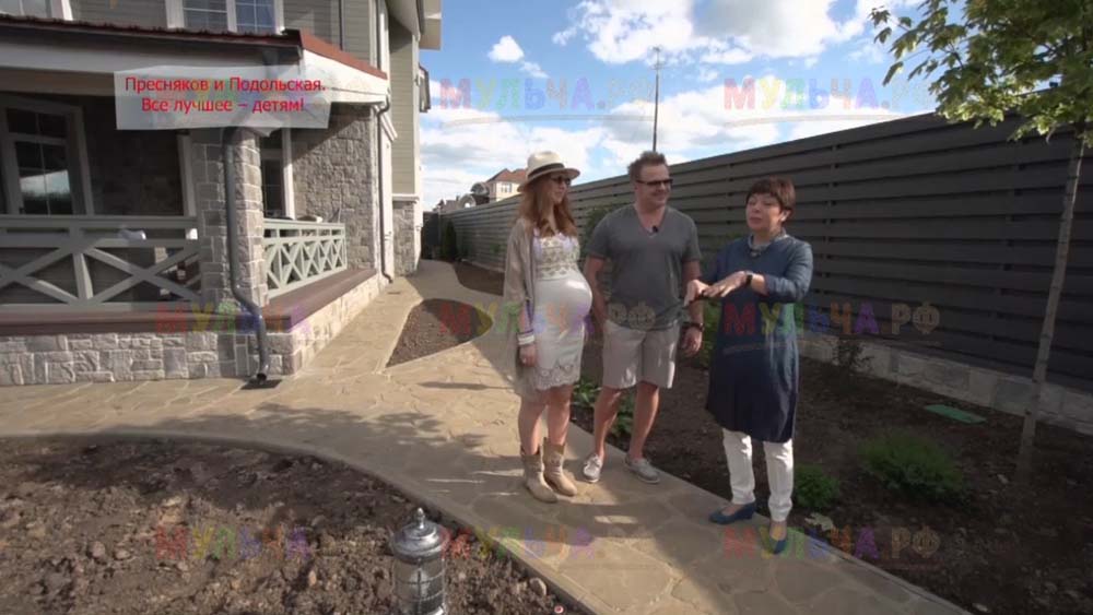 На участке появилась детская площадка с качелями и песочницей, красивые клумбы и множество хвойных деревьев. Чтобы уход за клумбами на доставлял хозяевам слишком много хлопот, дизайнеры укрыли их поверхность геотканью, а сверху насыпали прекрасную натуральную мульчу – кору лиственницы. Такое укрытие идеально защищает от сорняков, а, значит, избавляет от прополок. Кора выглядит замечательно и прекрасно пахнет, она сама по себе может считаться украшением сада. И, конечно, клумбы, устроенные таким образом, очень практичны, ведь они не отнимают у хозяев времени, которое можно посвятить более важным делам. Владимир Пресняков и Наталья Подольская оценили это!