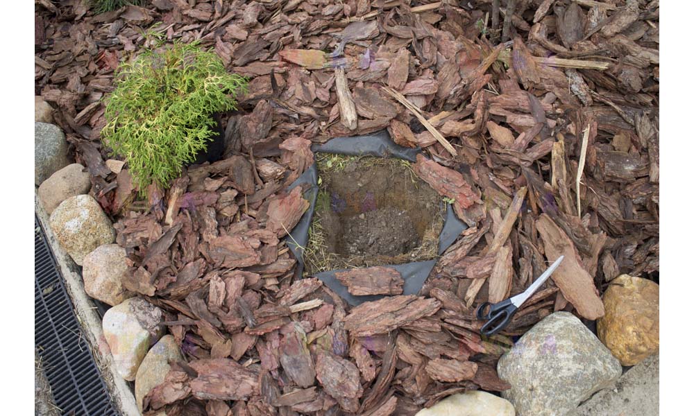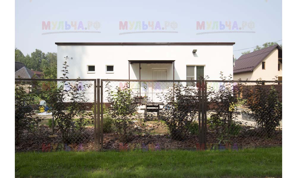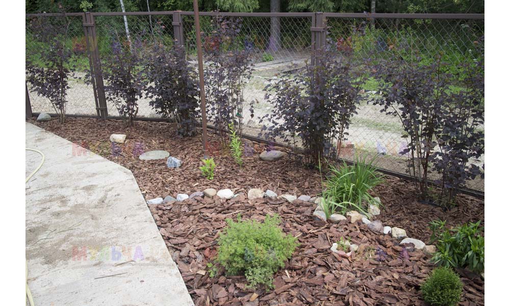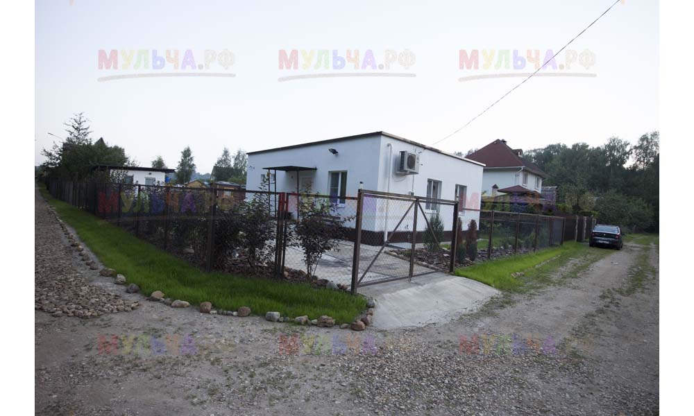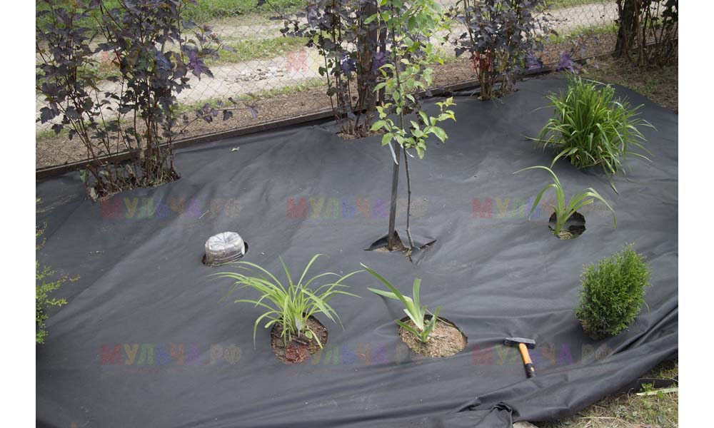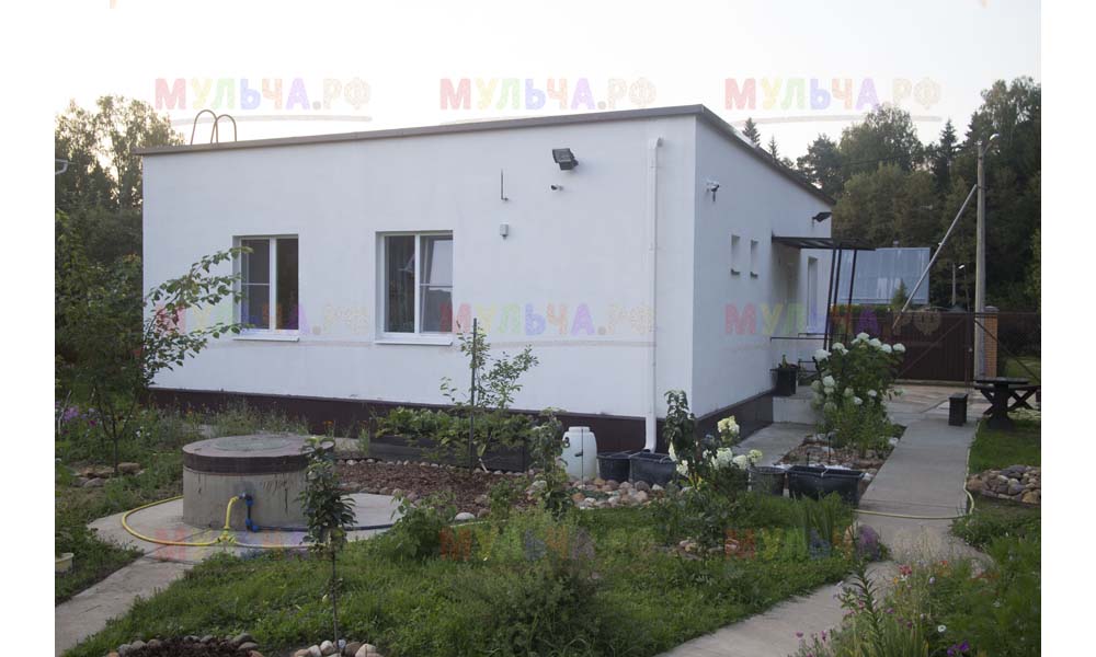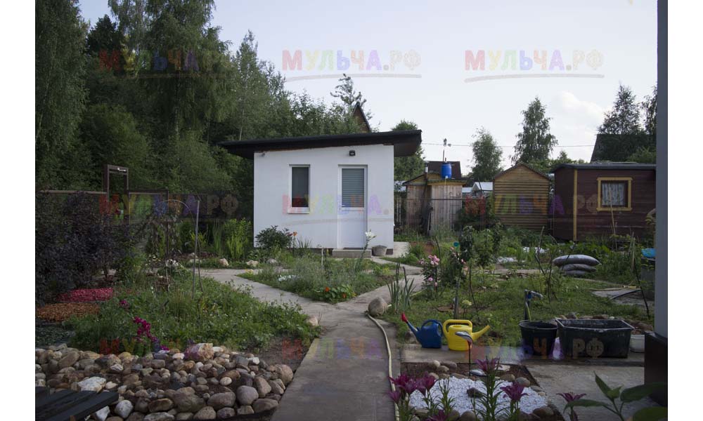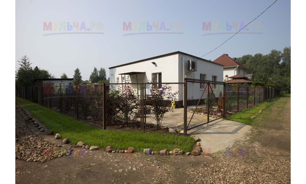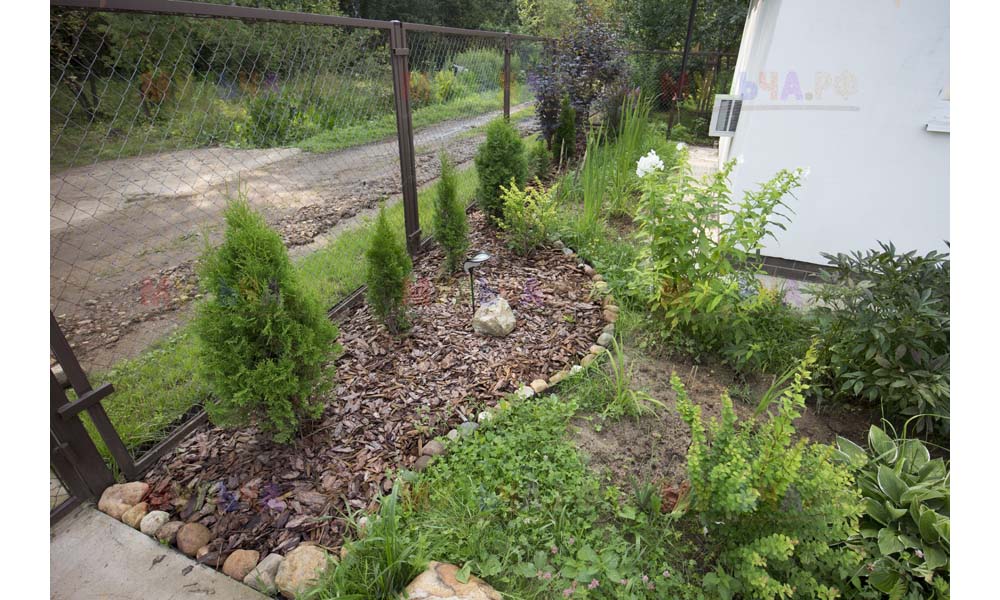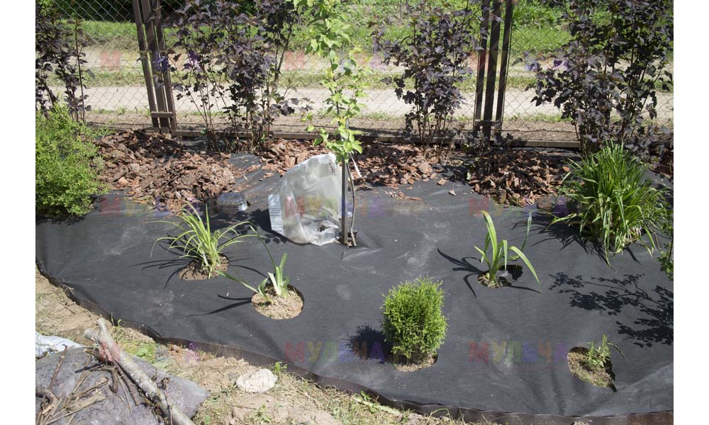Для мульчирования периметра была использована и кора сосны. Укладывается она также: на закрепленный специальными колышками слой геотекстиля. А под растения в геотекстиле прорезаются отверстия подходящего размера. Быстро, просто и удобно!