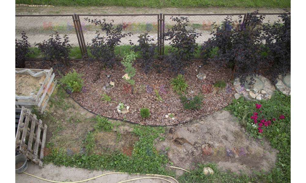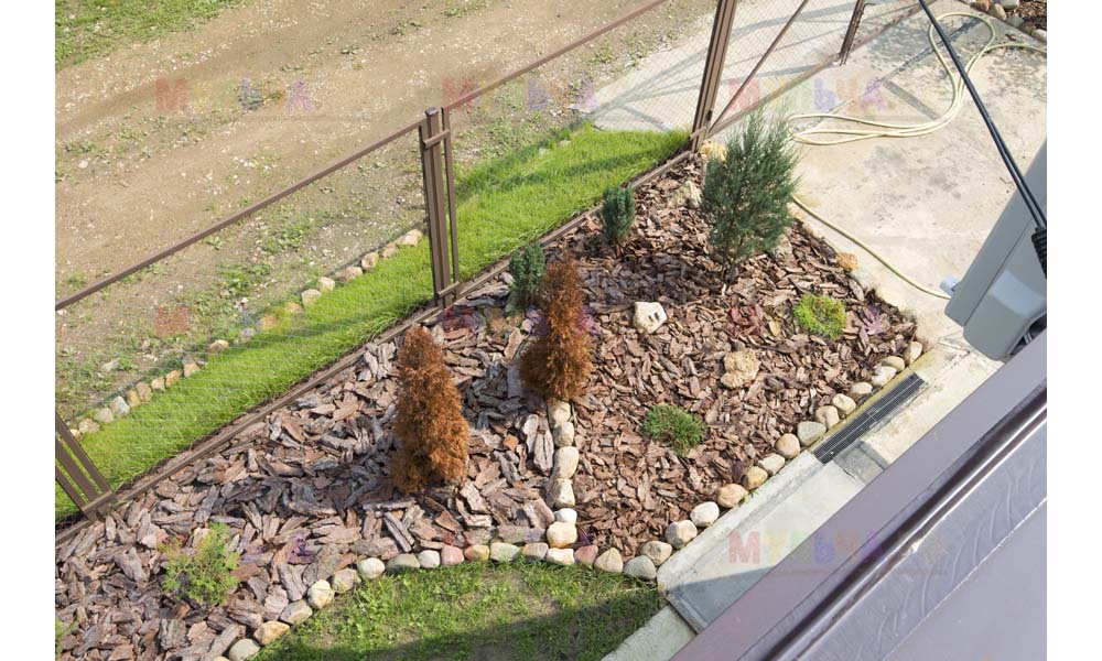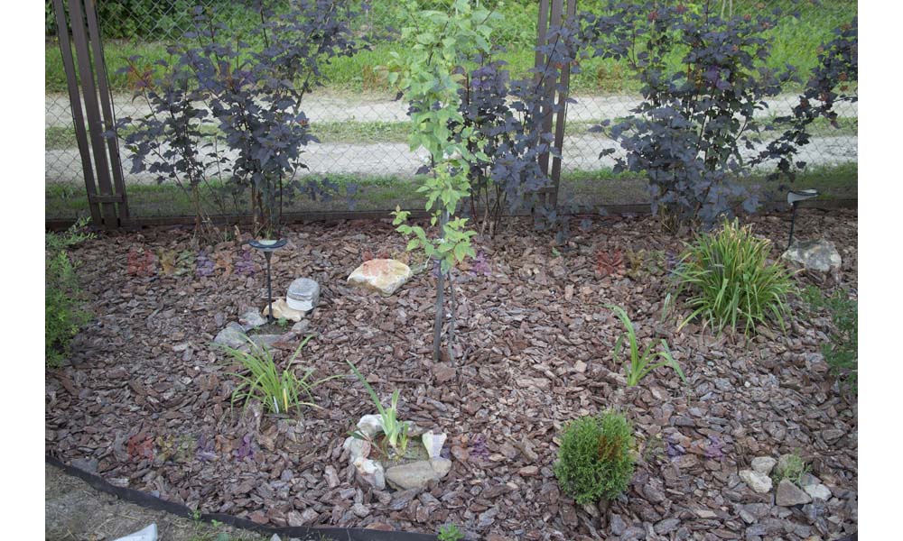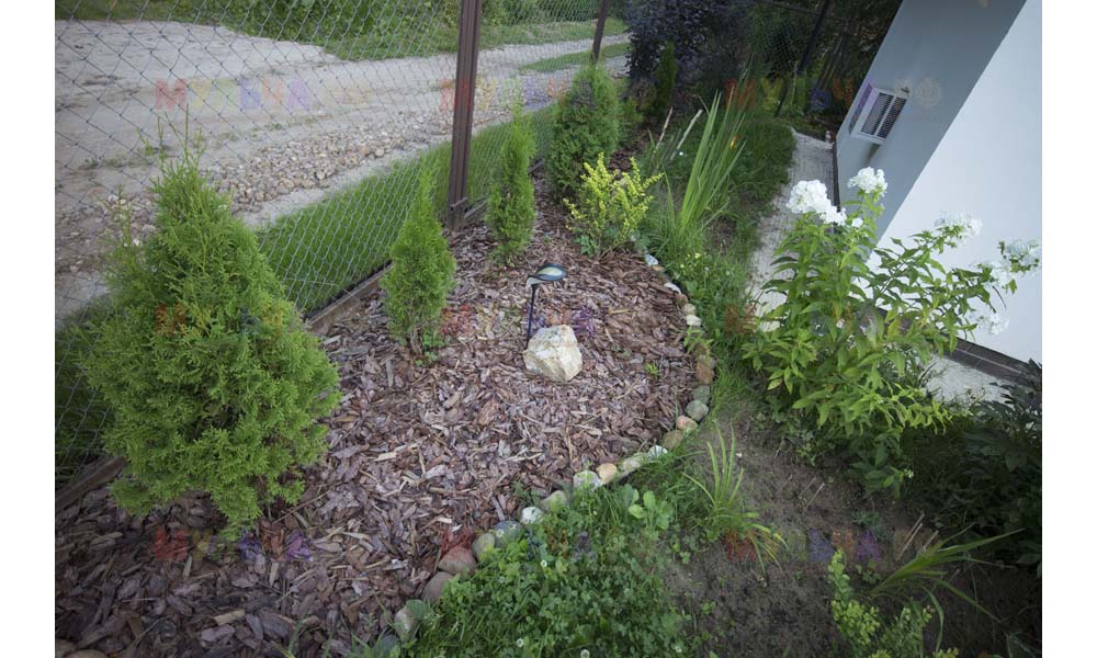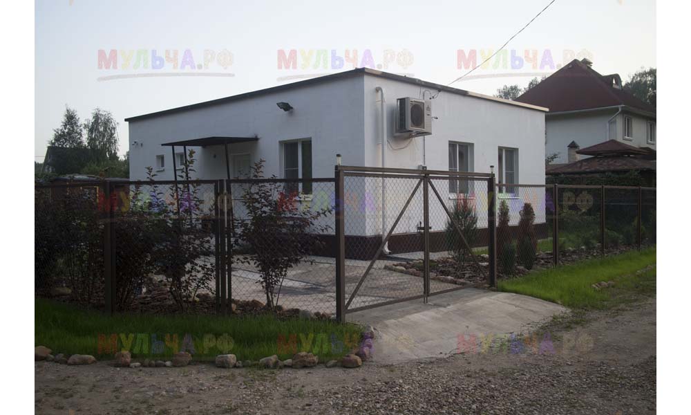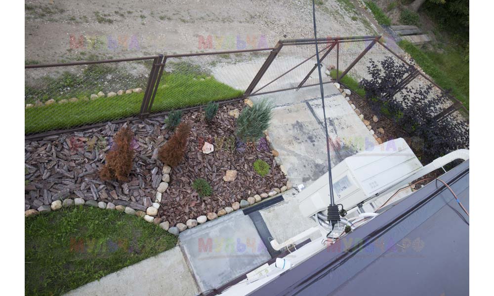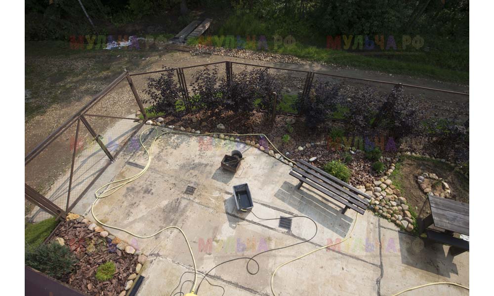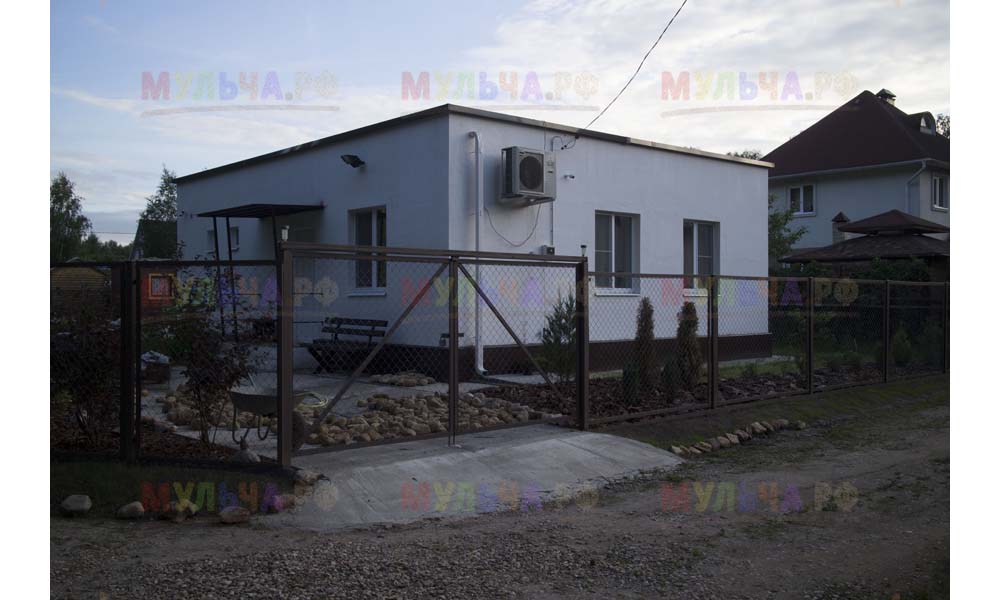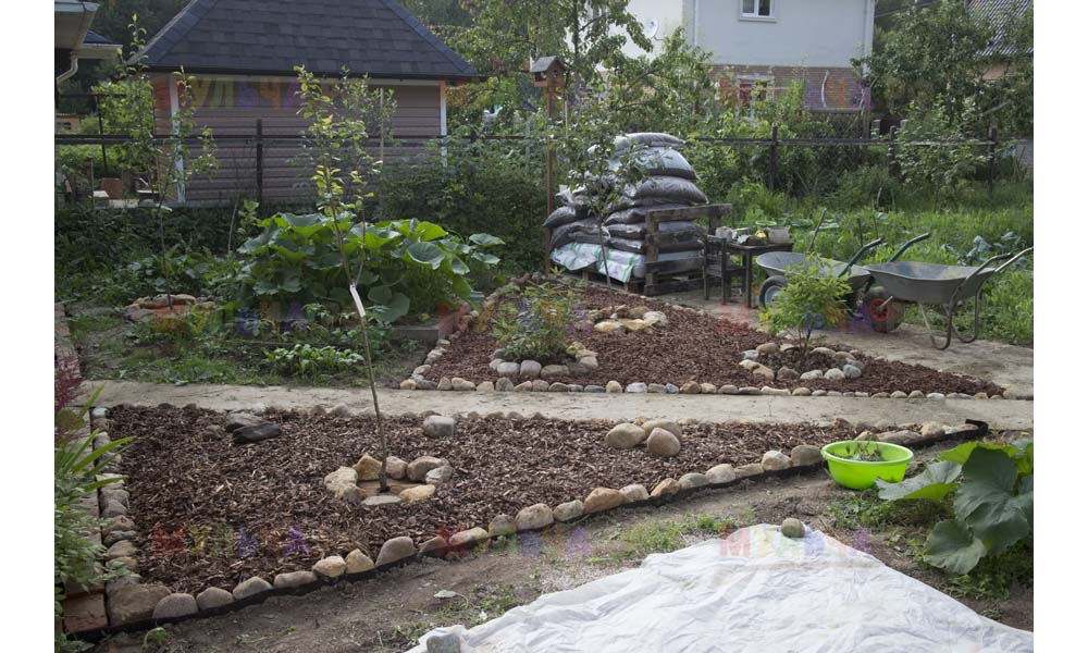 Для мульчирования периметра была использована и кора сосны. Укладывается она также: на закрепленный специальными колышками слой геотекстиля. А под растения в геотекстиле прорезаются отверстия подходящего размера. Быстро, просто и удобно!