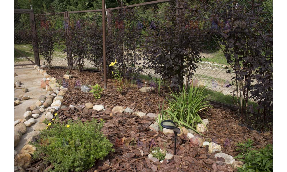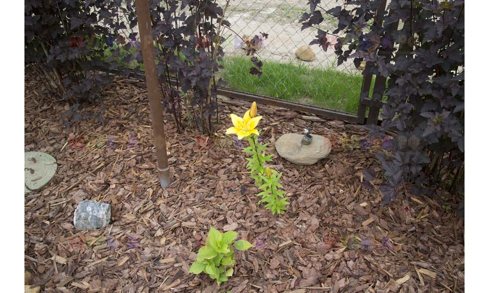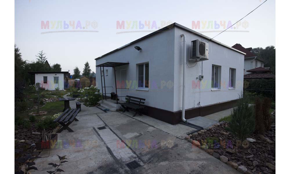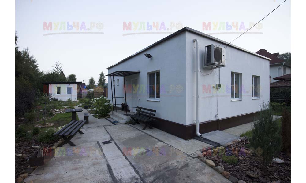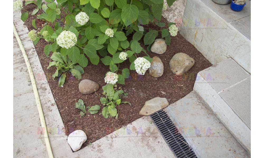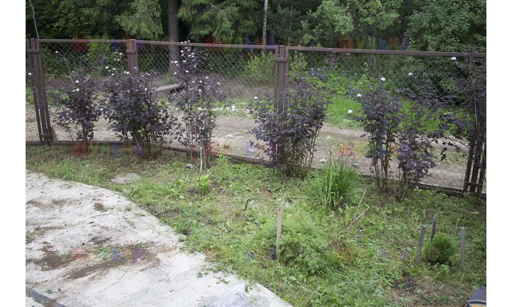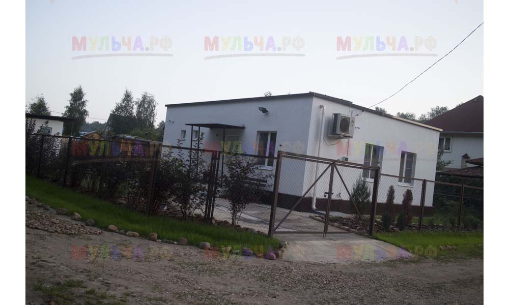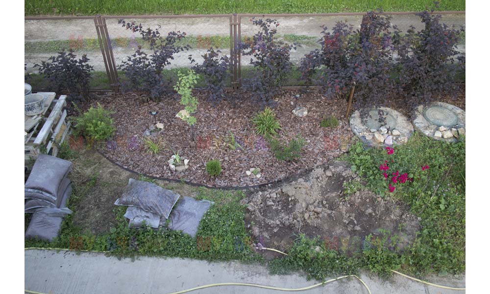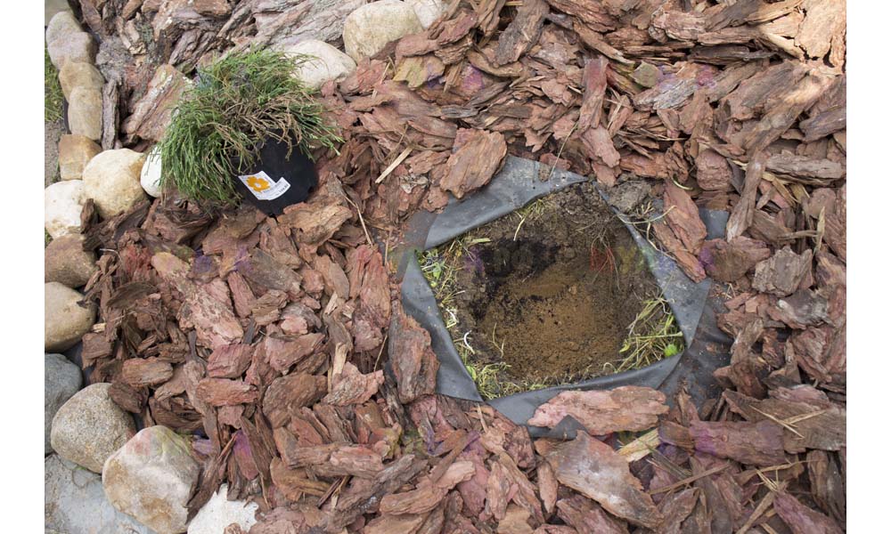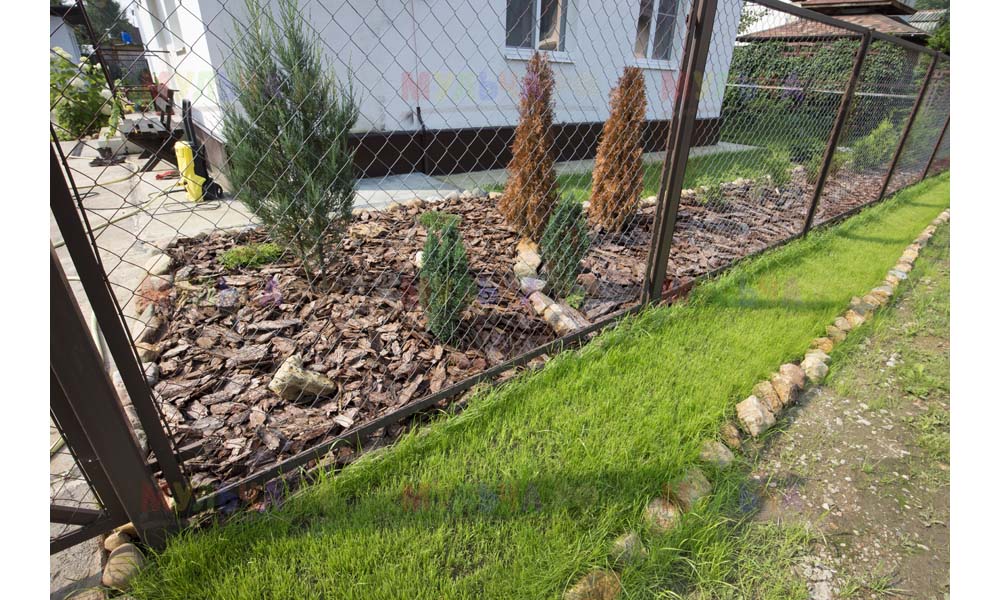 Для мульчирования периметра была использована и кора сосны. Укладывается она также: на закрепленный специальными колышками слой геотекстиля. А под растения в геотекстиле прорезаются отверстия подходящего размера. Быстро, просто и удобно!