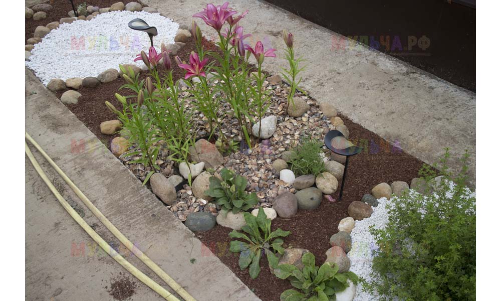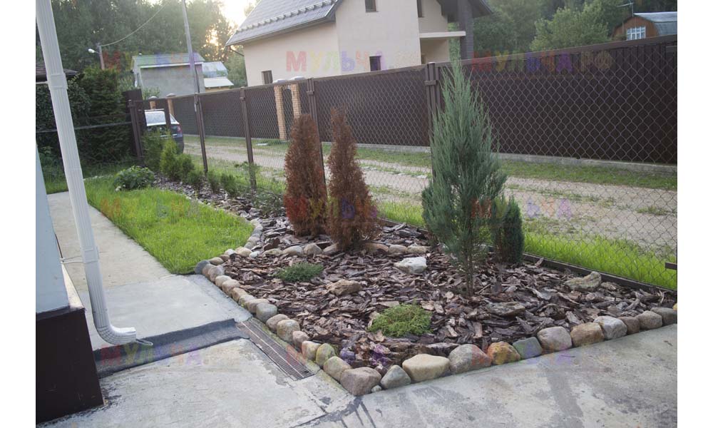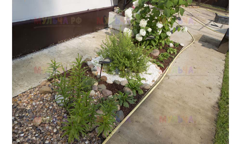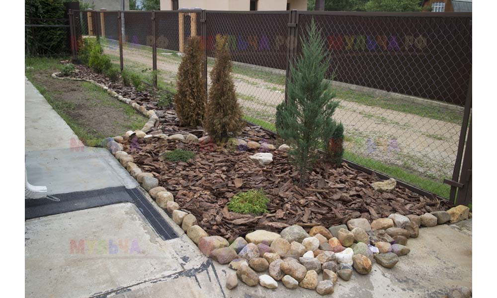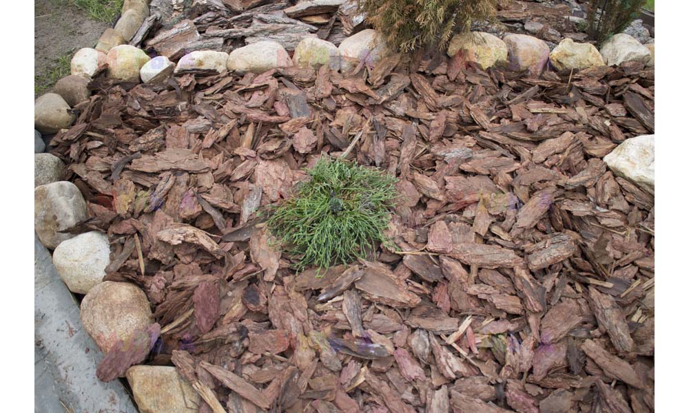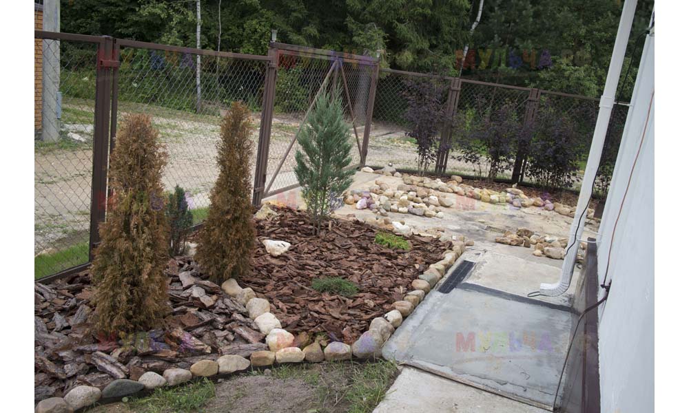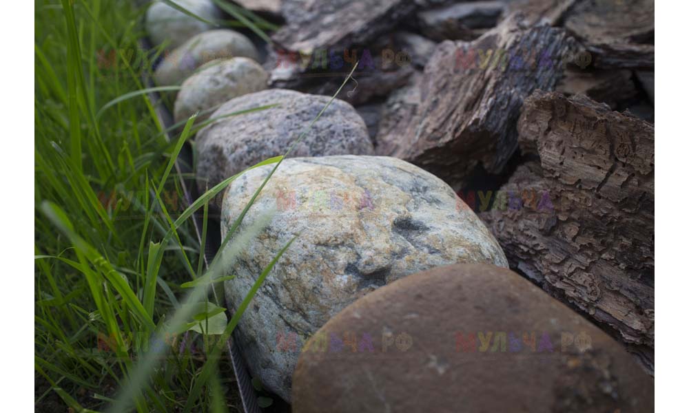 Кора лиственницы — очень красивый мульчирующий материал. Но нет предела совершенству! Комбинируйте кору лиственницы с другими натуральными материалами, например, камнями, и вы получите потрясающий результат.