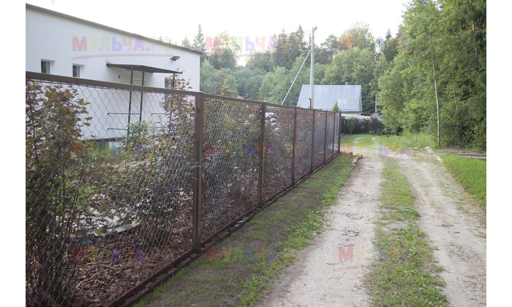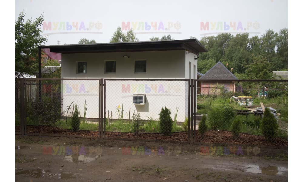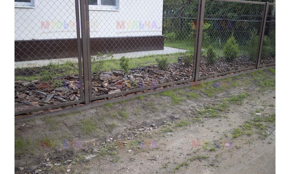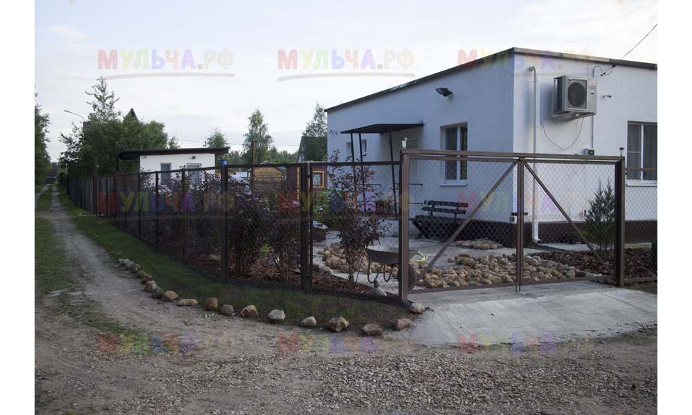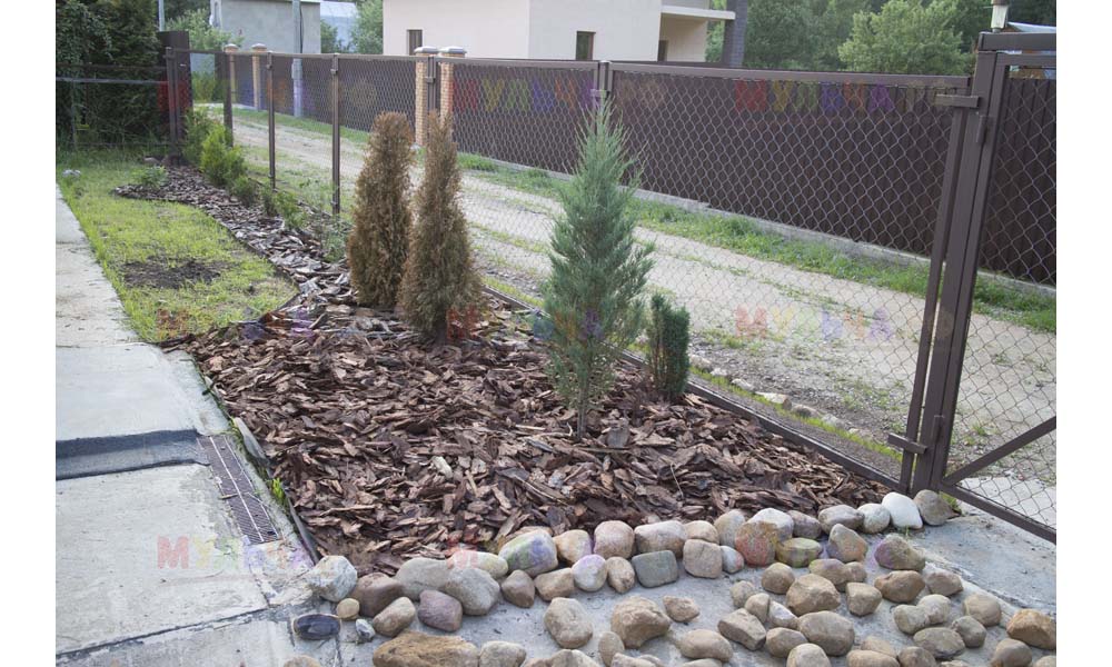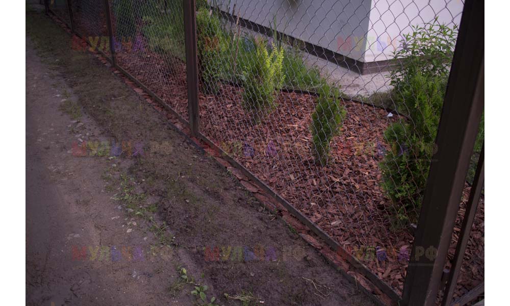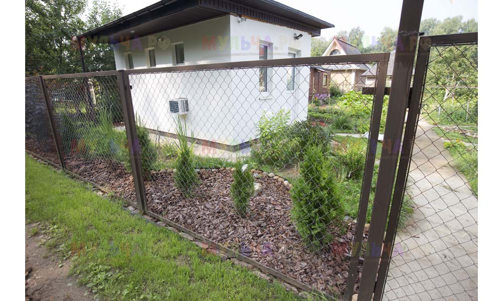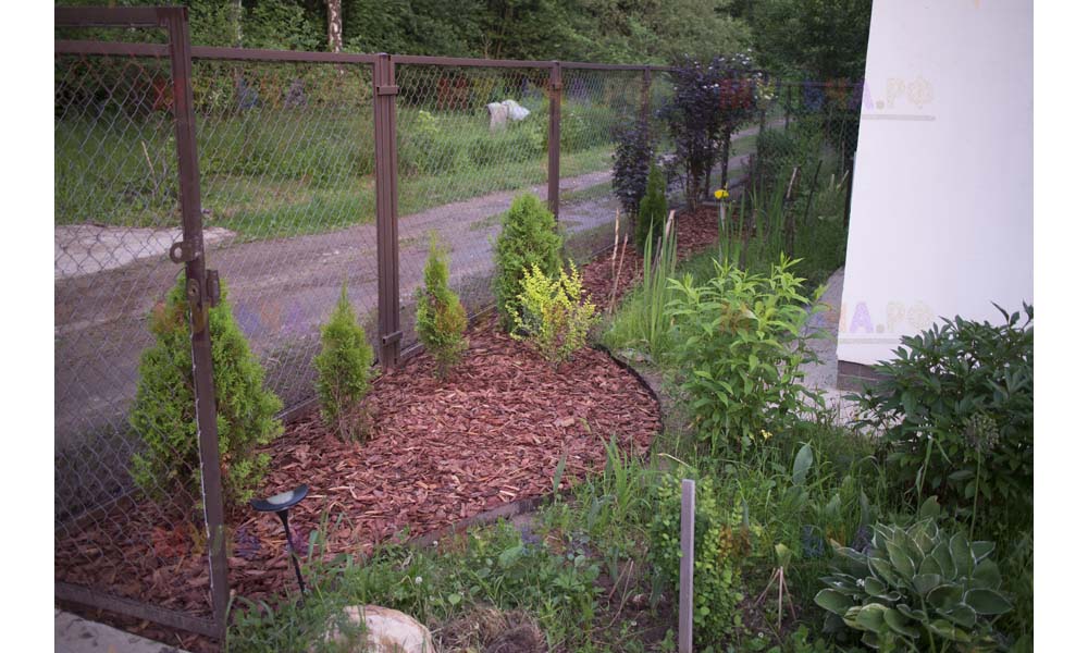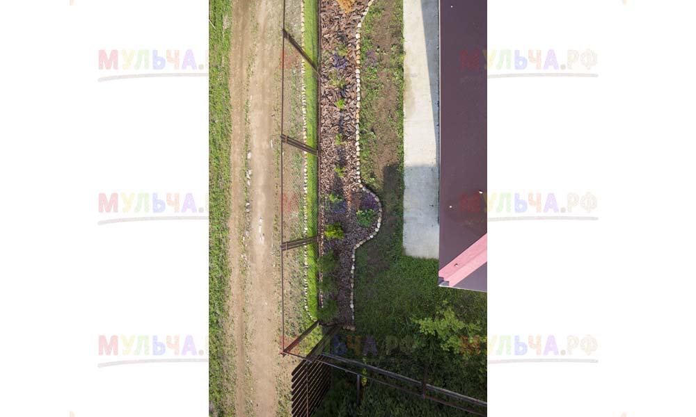 Даже сложные участки, расположенные вдоль забора, можно эффективно защитить от сорных растений. Бордюрная лента, черный геотекстиль и в качестве финального слоя — кора лиственницы. И территория буквально преображается!