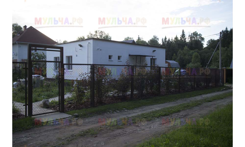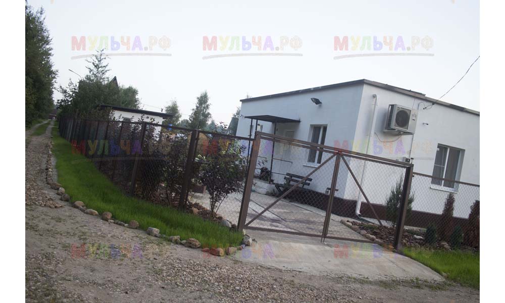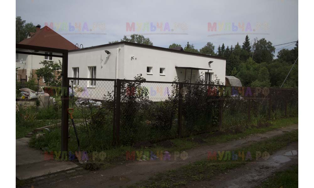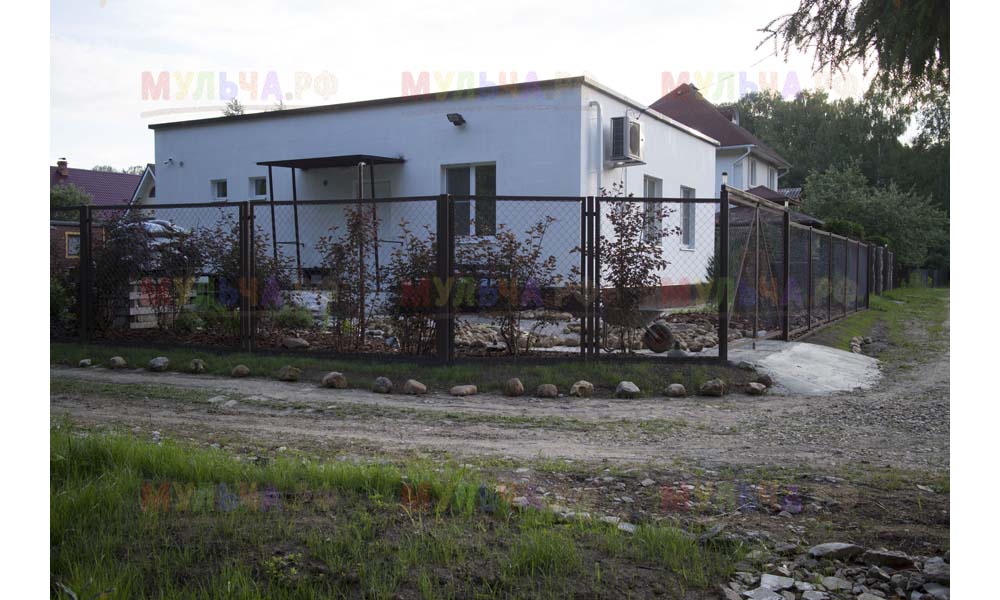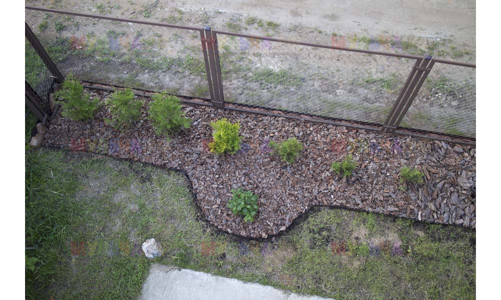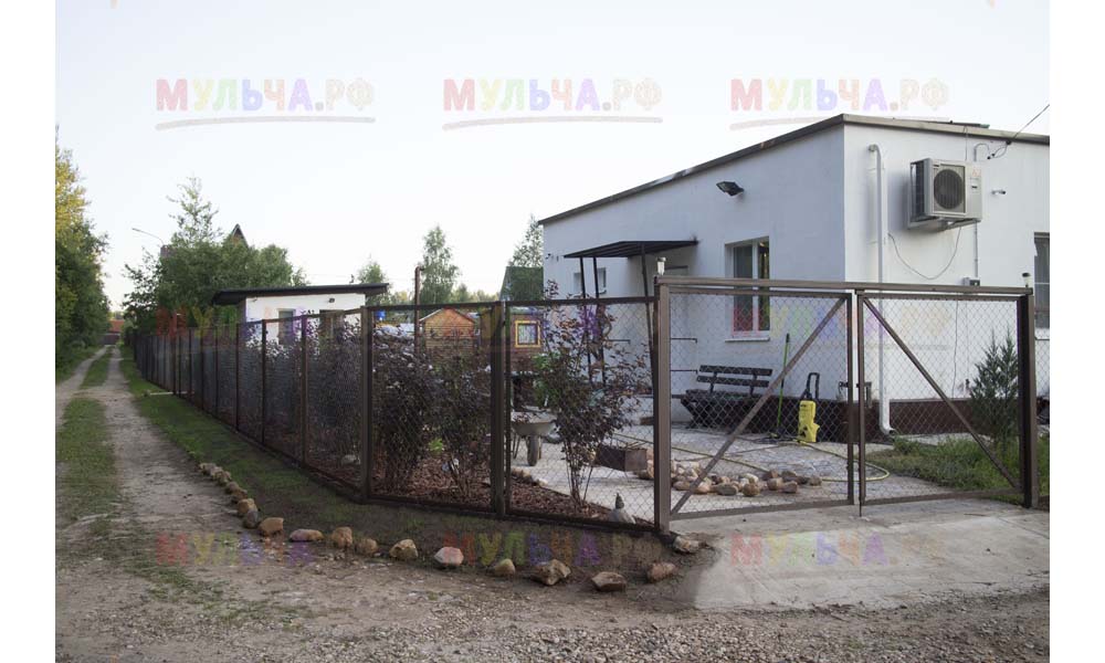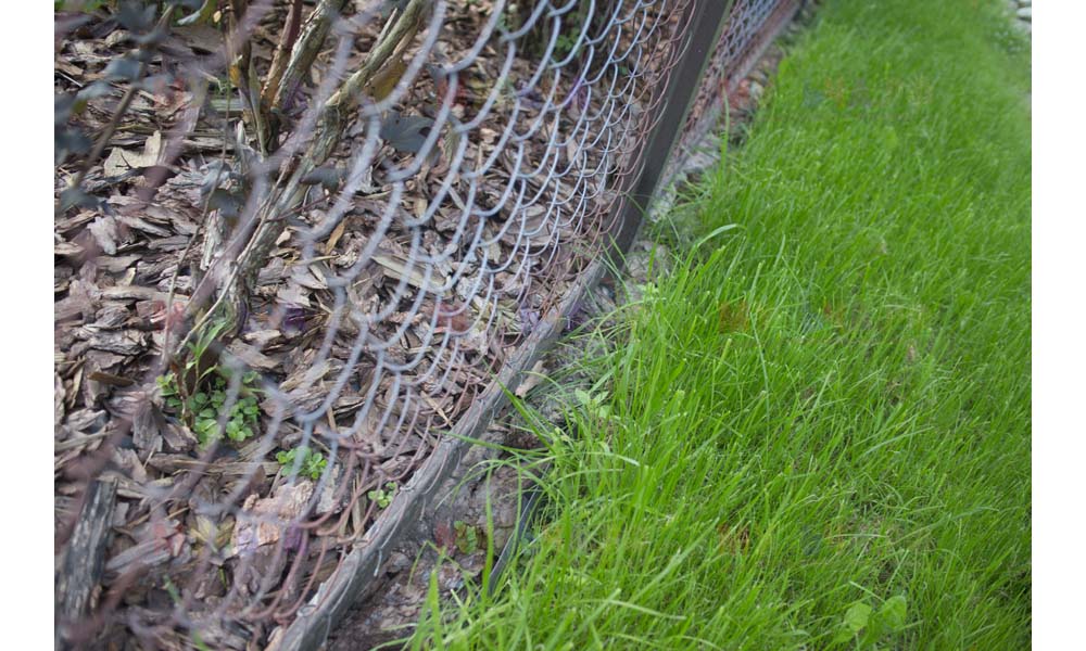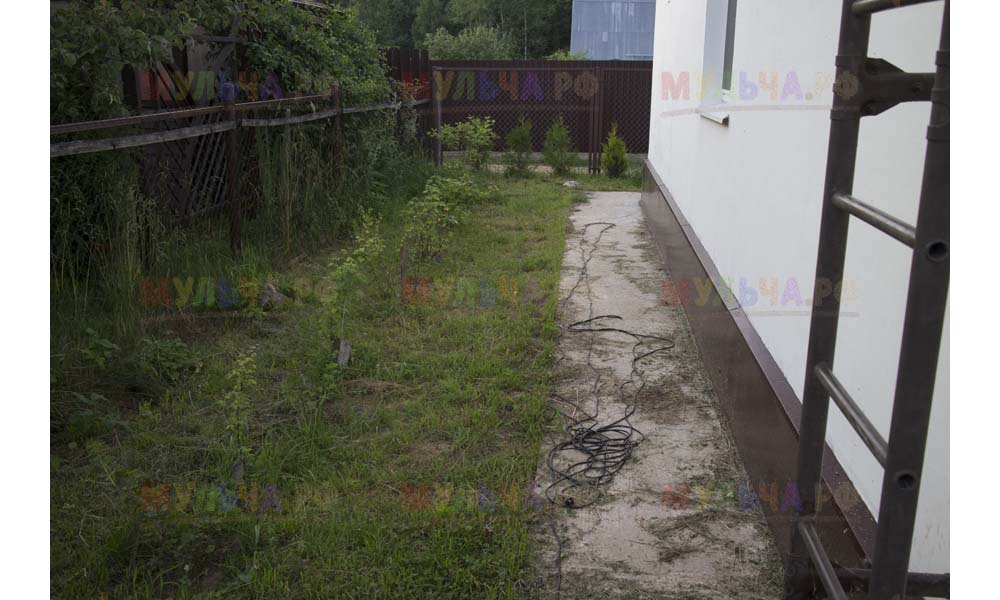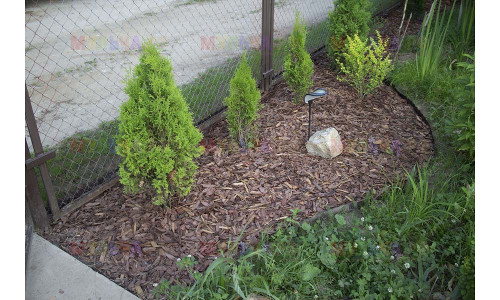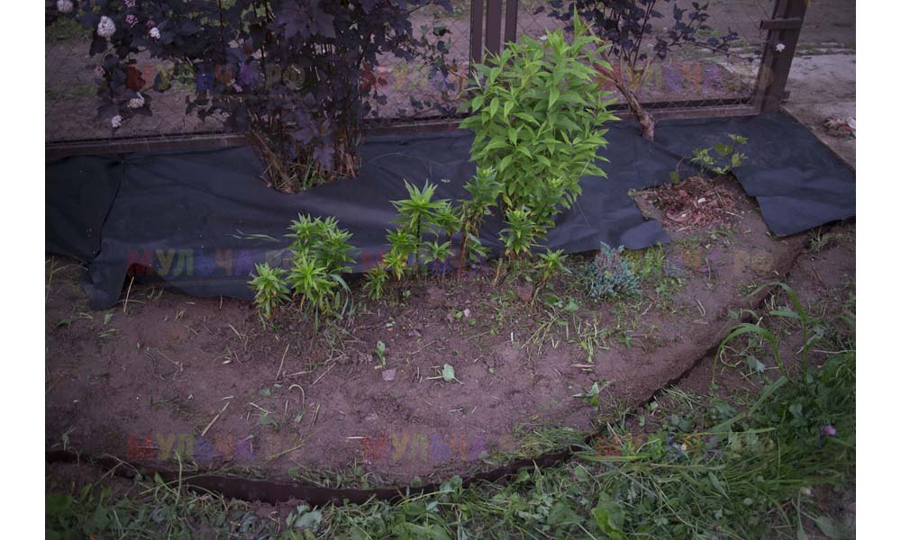 Даже сложные участки, расположенные вдоль забора, можно эффективно защитить от сорных растений. Бордюрная лента, черный геотекстиль и в качестве финального слоя — кора лиственницы. И территория буквально преображается!