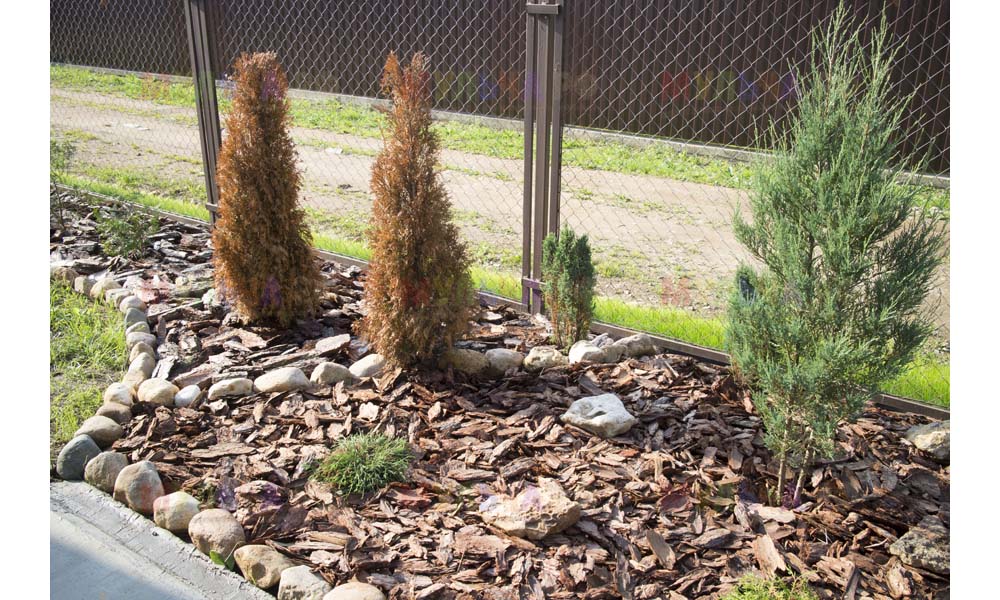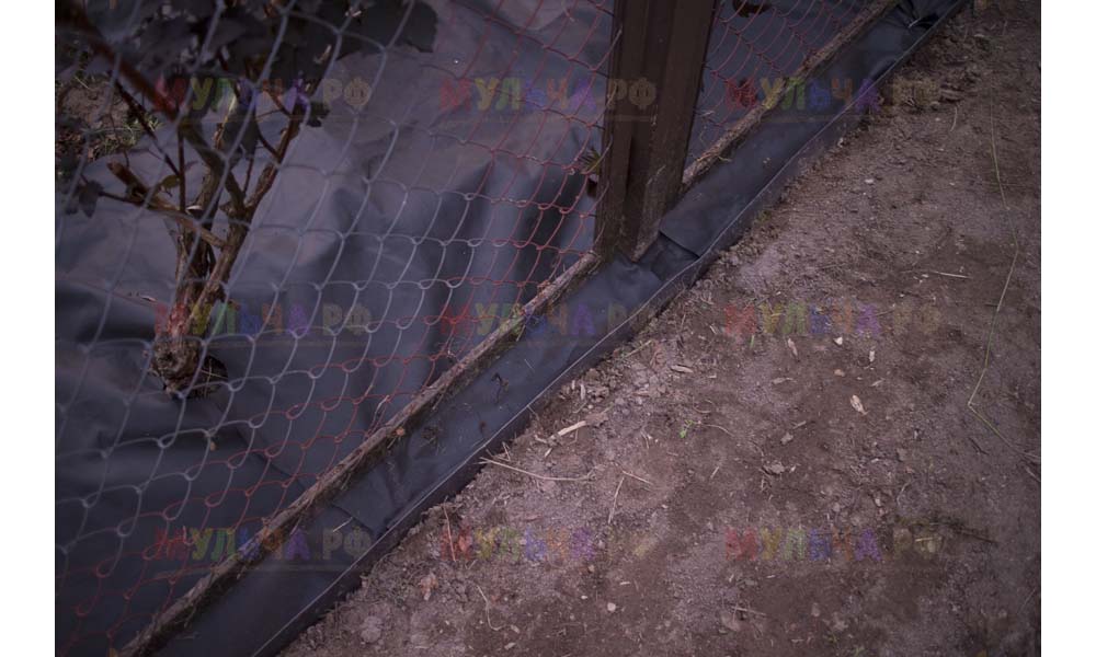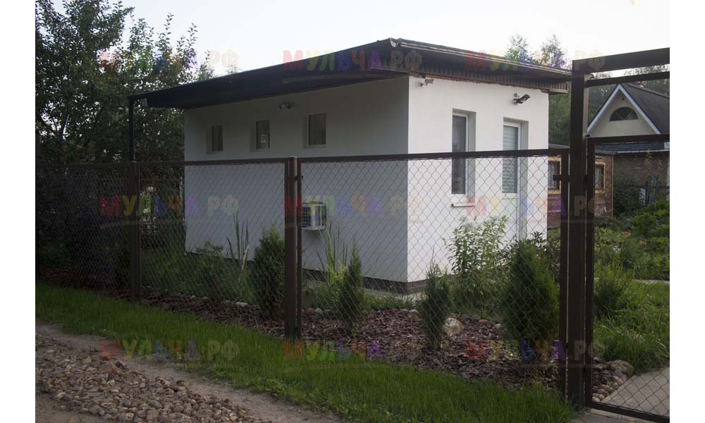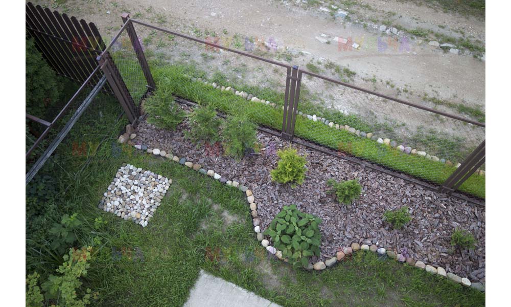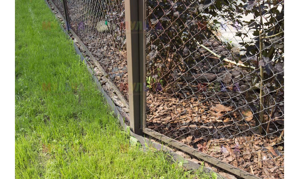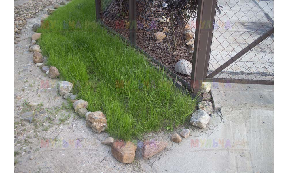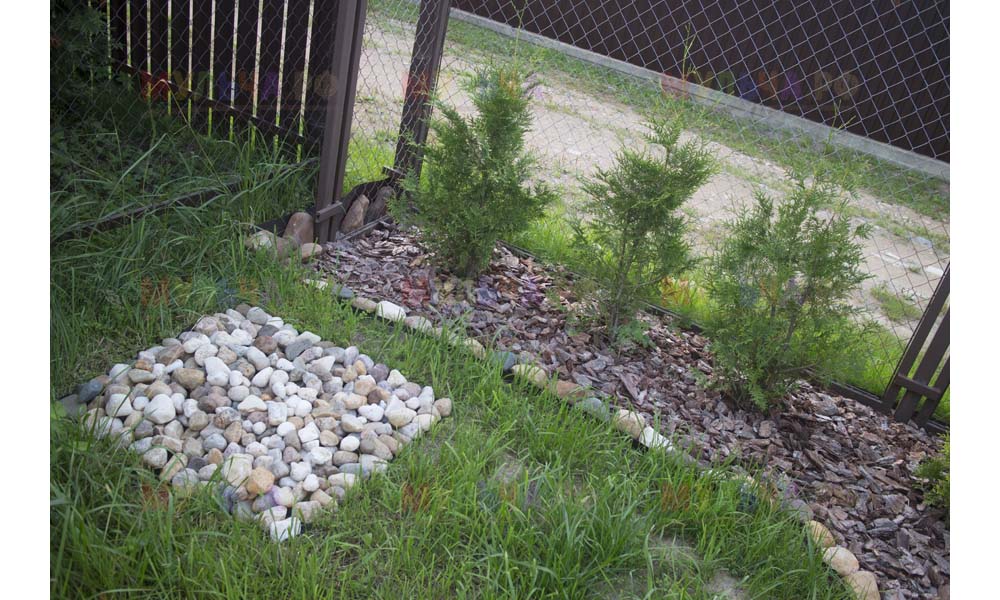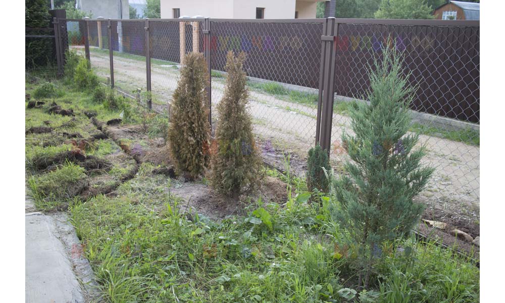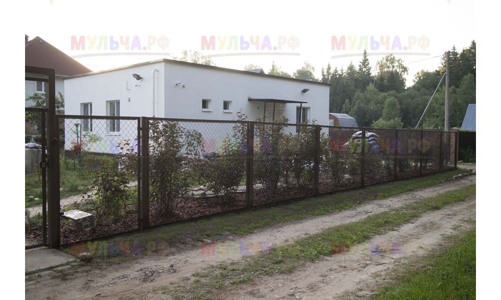 Даже сложные участки, расположенные вдоль забора, можно эффективно защитить от сорных растений. Бордюрная лента, черный геотекстиль и в качестве финального слоя — кора лиственницы. И территория буквально преображается!