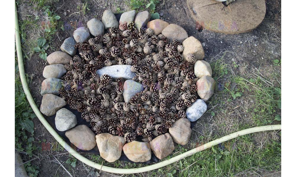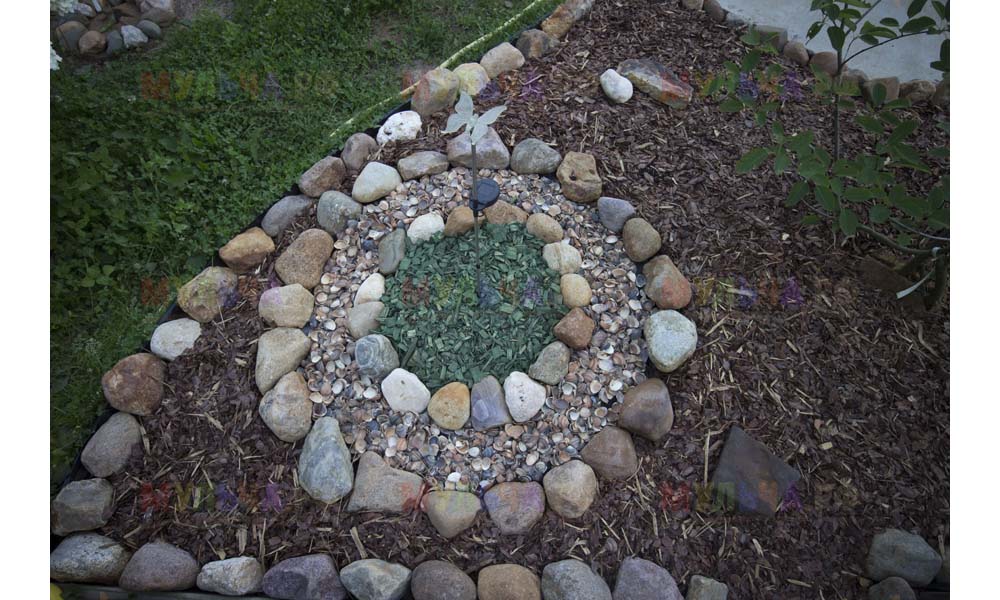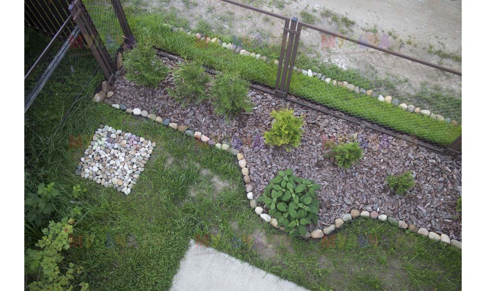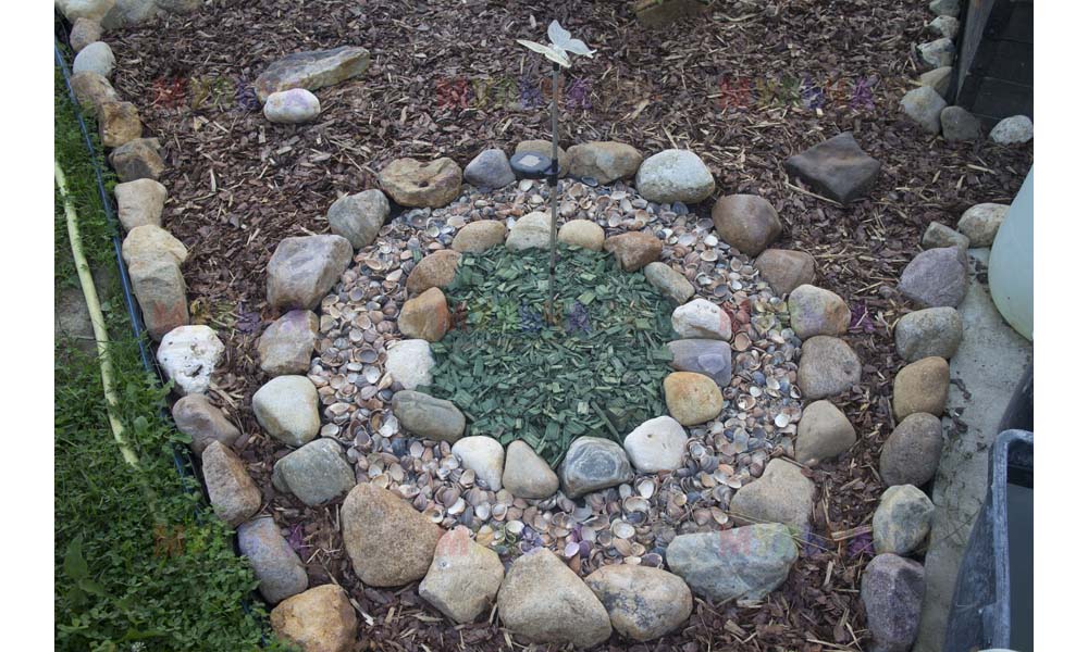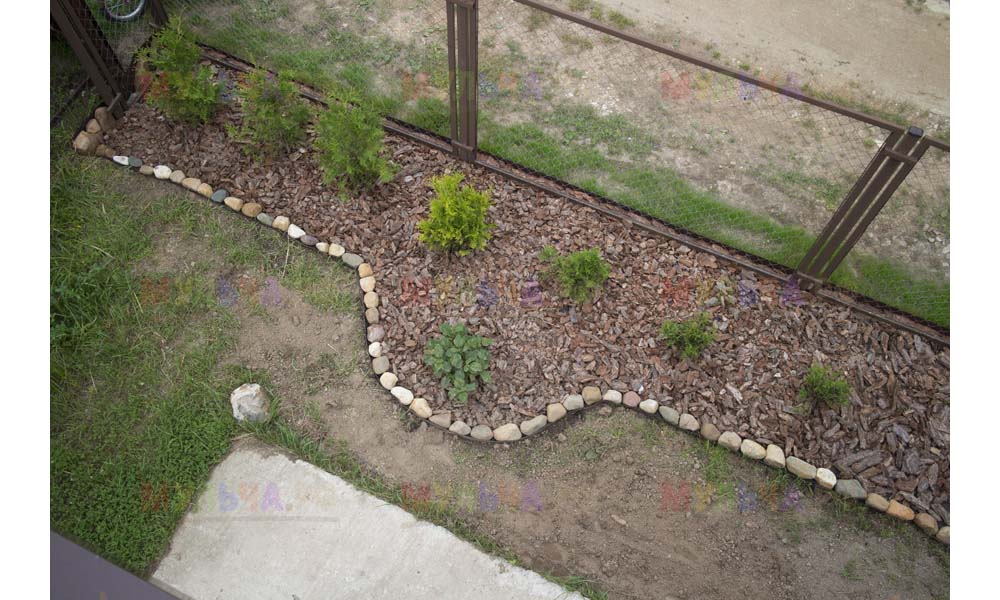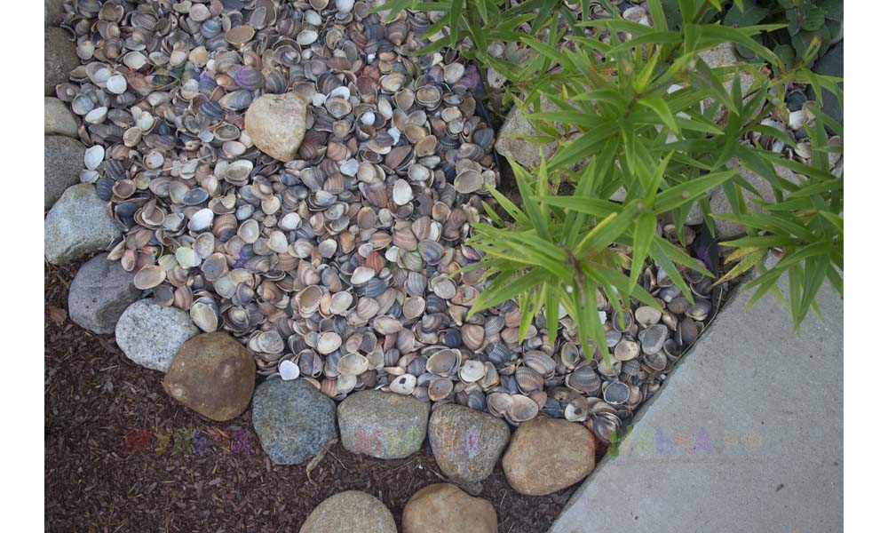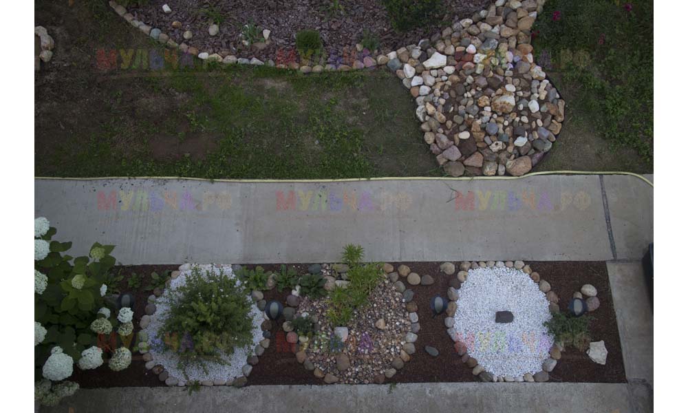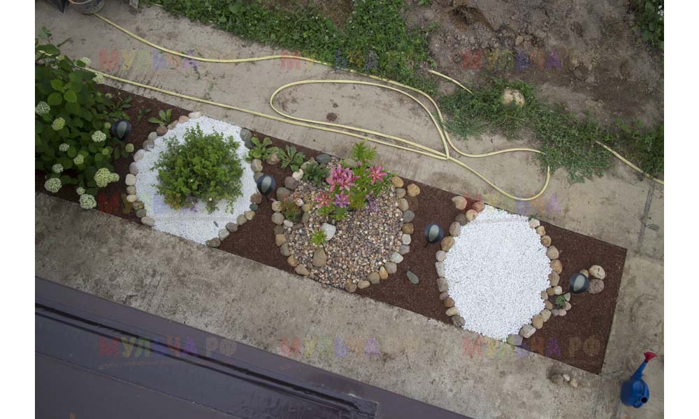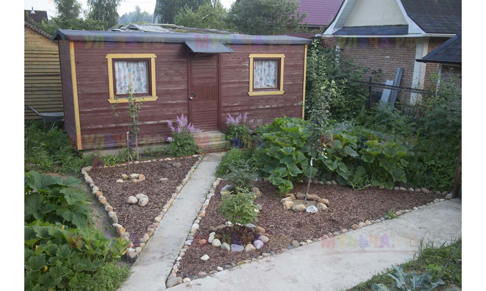 На участке Виктора нашлась работа и для морской ракушки, и для гальки, и для окрашенной коры, и для мраморной крошки, и даже для сосновых шишек.