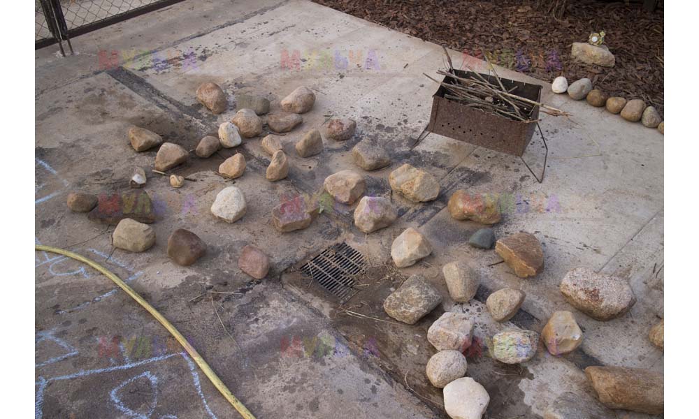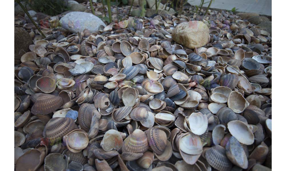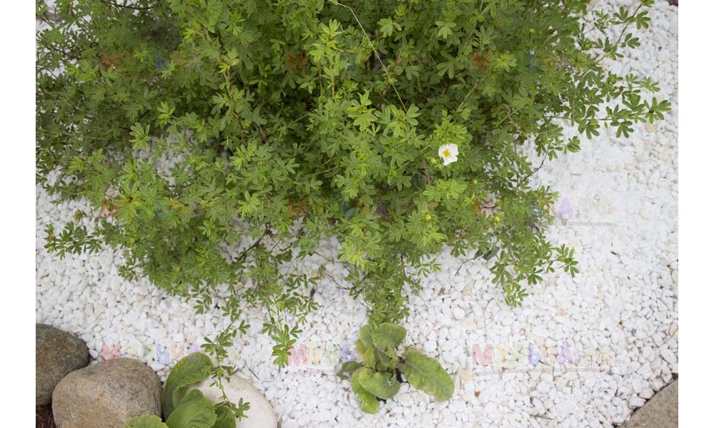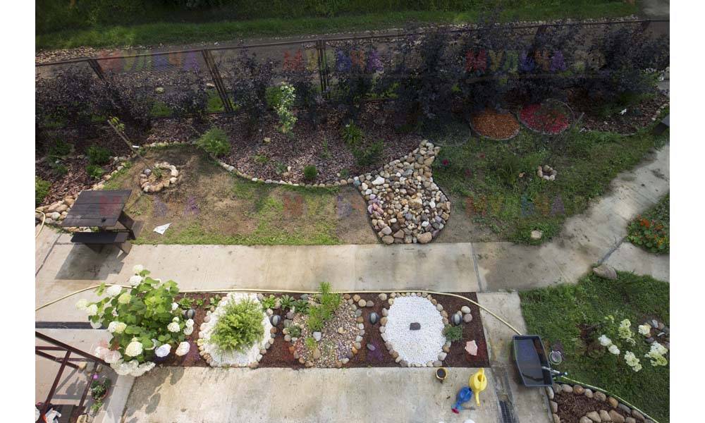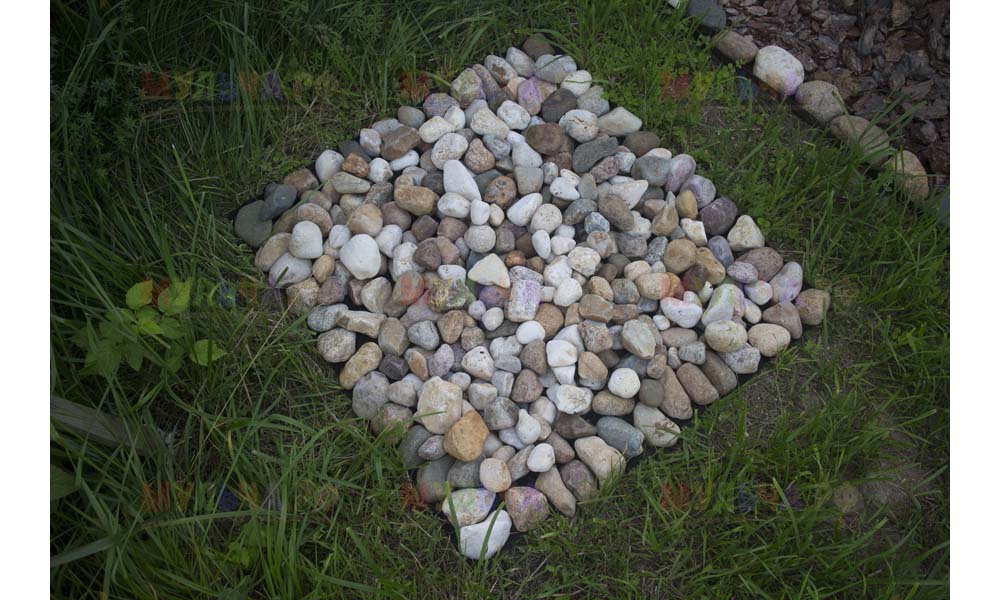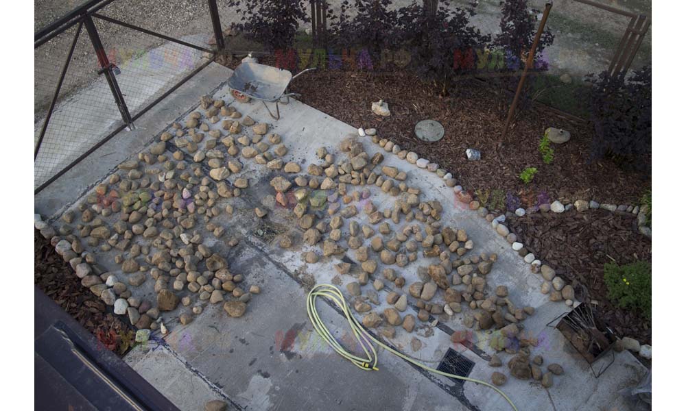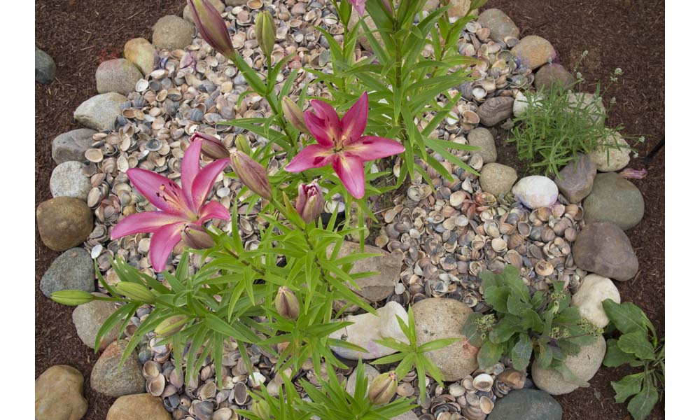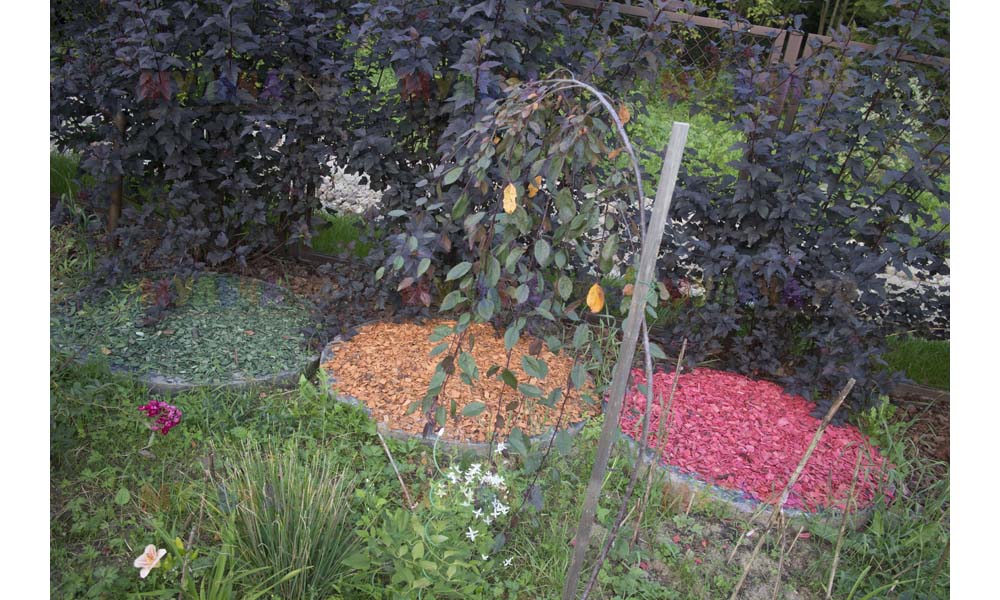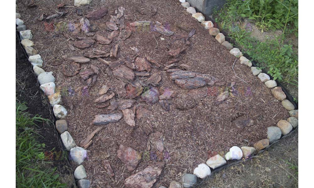 На участке Виктора нашлась работа и для морской ракушки, и для гальки, и для окрашенной коры, и для мраморной крошки, и даже для сосновых шишек.